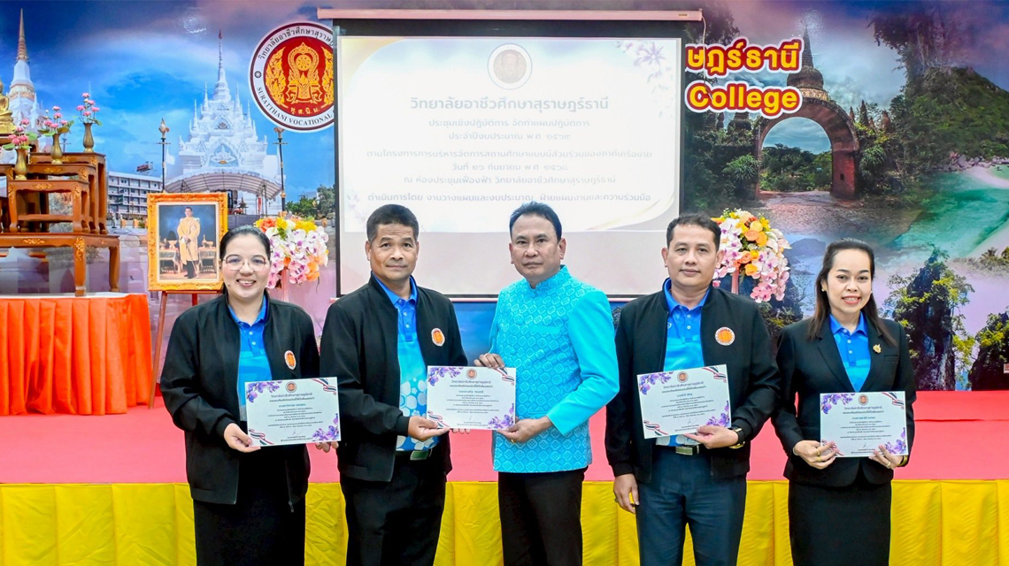 วันศุกร์ที่ 26 กันยายน 2568 นายพงษ์ศักดิ์ นุ้ยเจริญ ผู้อำนวยการวิทยาลัยอาชีวศึกษาสุราษฎร์ธานี ให้เกียรติมอบเกียรติบัตรให้แก่คณะผู้บริหาร ครู และบุคลากรทางการศึกษา