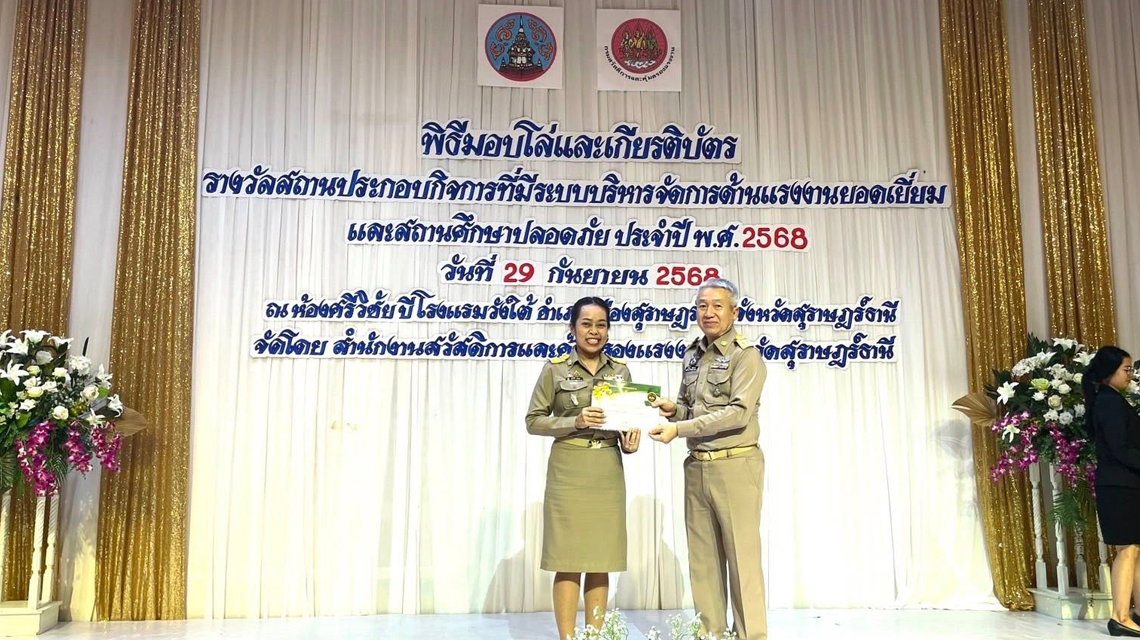 เข้ารับเกียรติบัตร รางวัลสถานศึกษาปลอดภัยประจำปี 2568 ณ ห้องศรีวิชัย โรงแรมวังใต้ อำเภอเมือง จังหวัดสุราษฎร์ธานี จัดโดย:สำนักงานสวัสดิการและคุ้มครองแรงงานจังหวัดสุราษฎร์ธานี